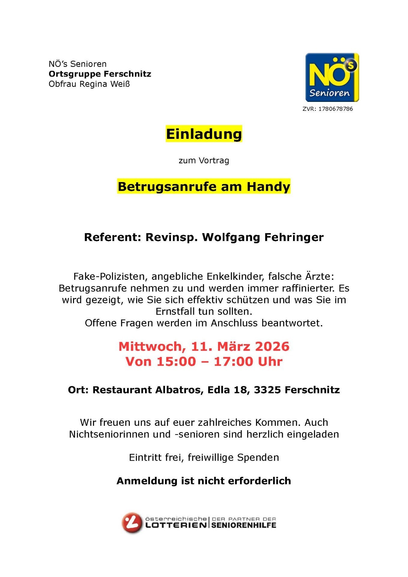 Einladung zum Vortrag Betrugsanrufe am Handy von den NÖs Senioren Ferschnitz